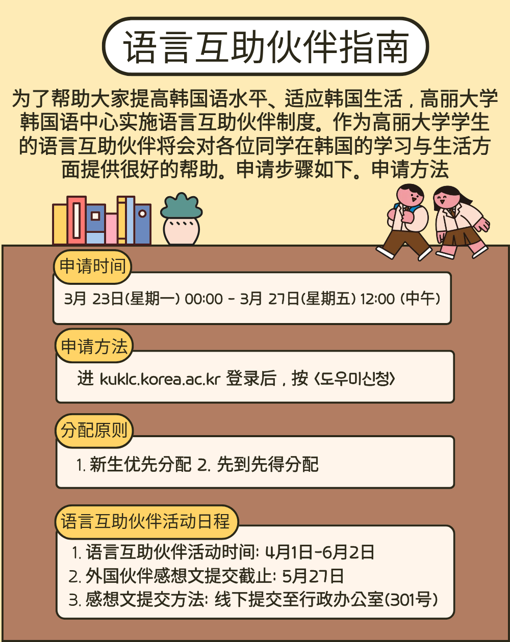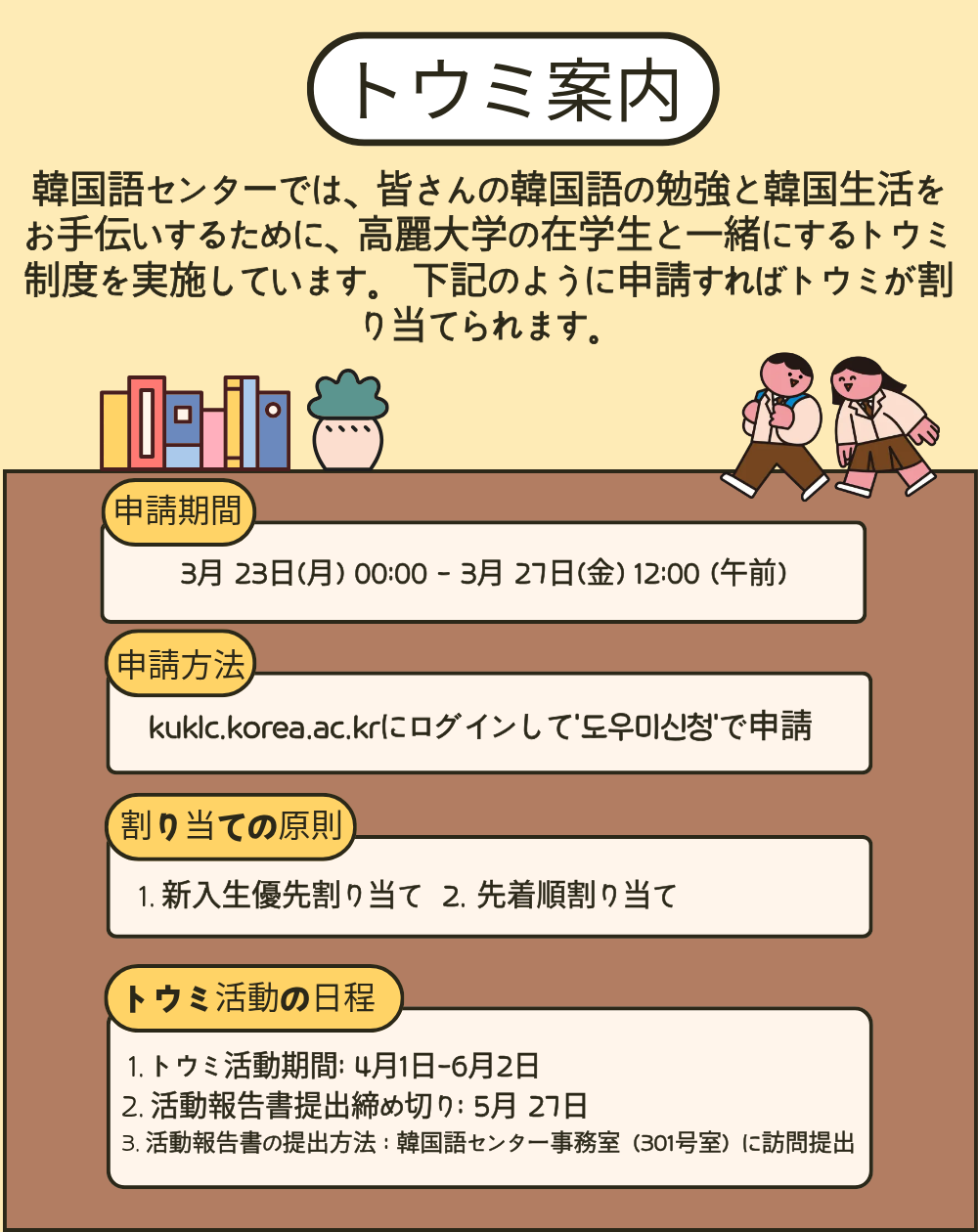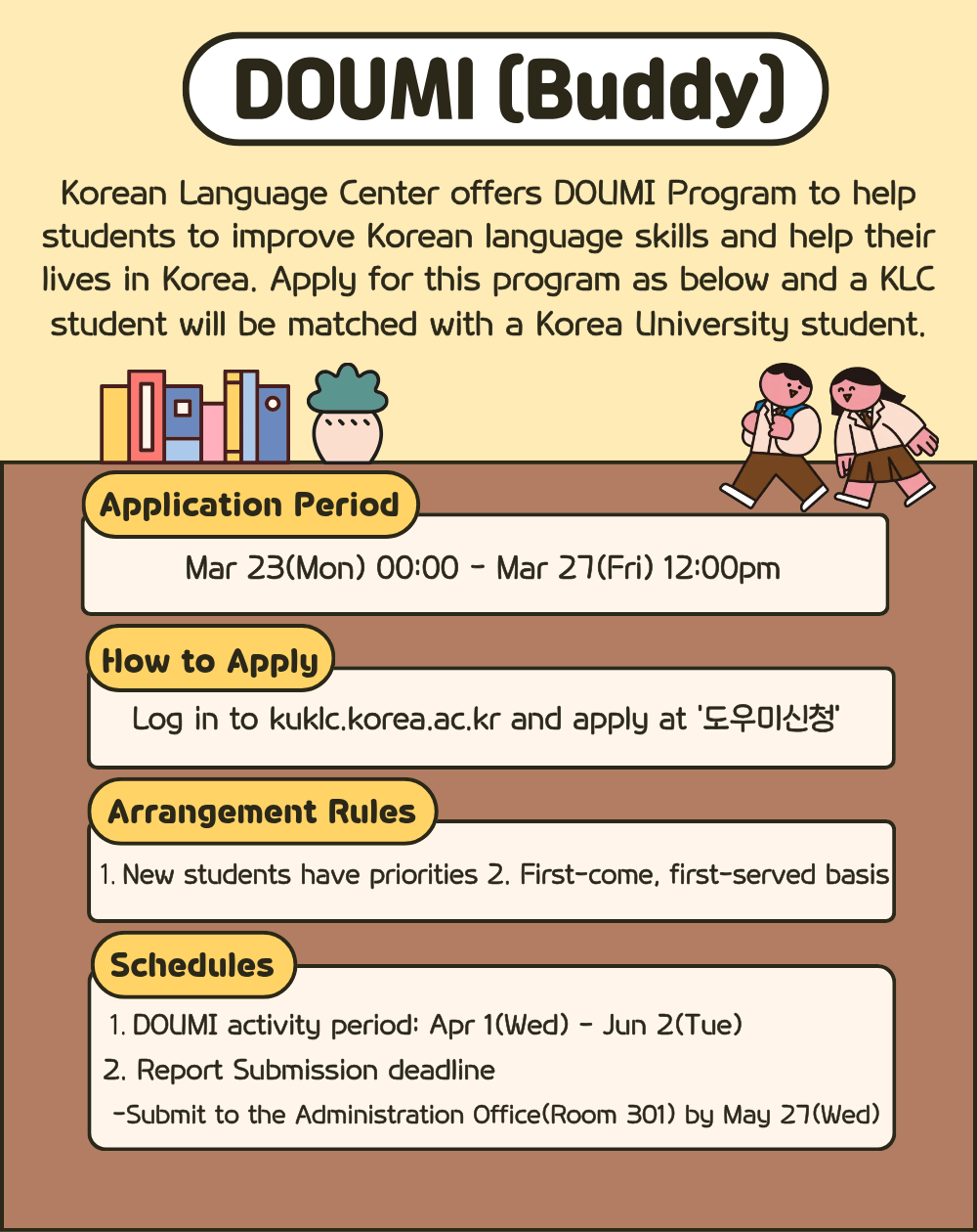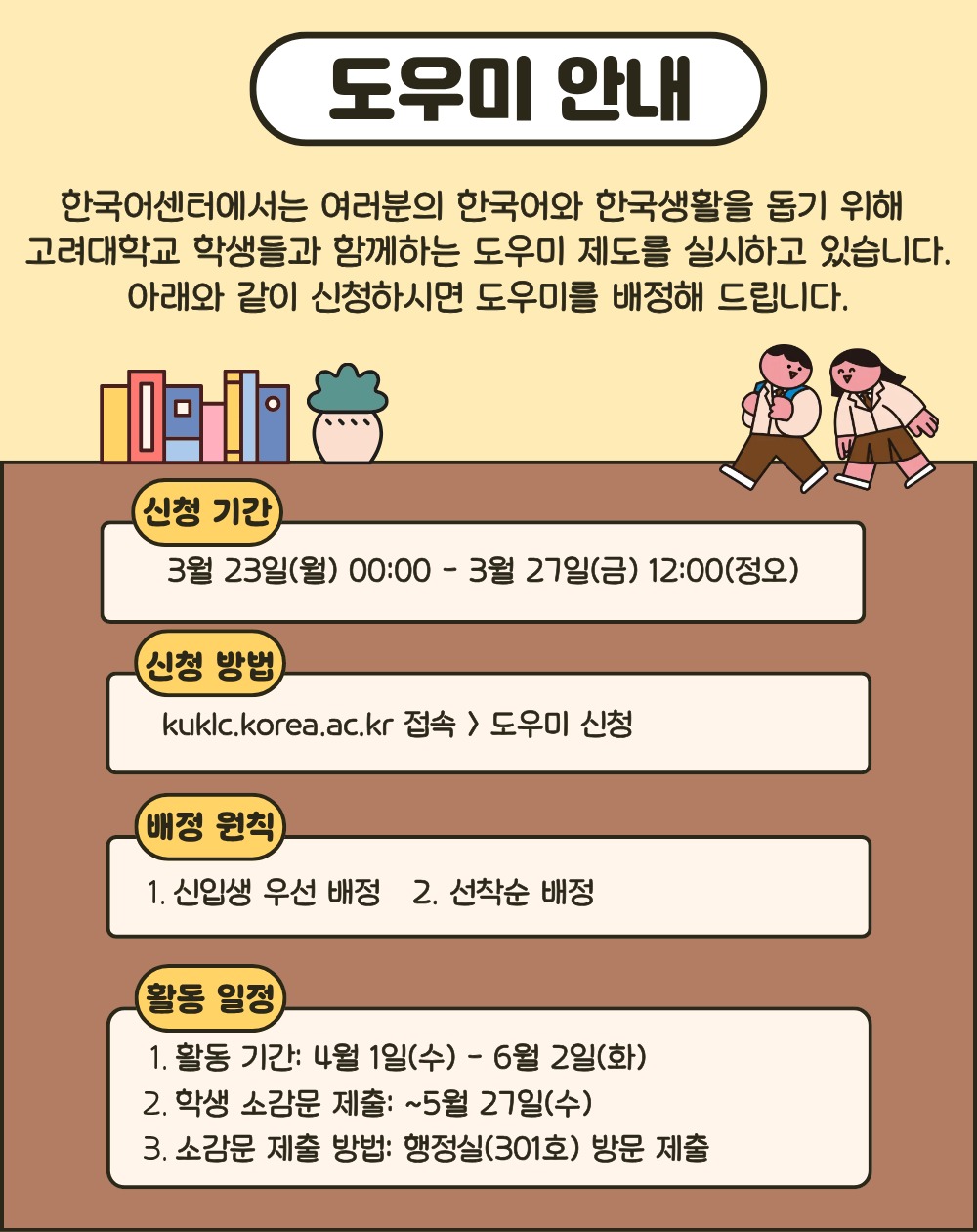 2026학년도 정규과정 봄학기 도우미 모집 안내 / DOUMI (Buddy) for 2026 Spring Semester / 2026正规课程春季学期语言互助伙伴指南 / 2026学年度正規課程春学期トウミ募集のご案内 |